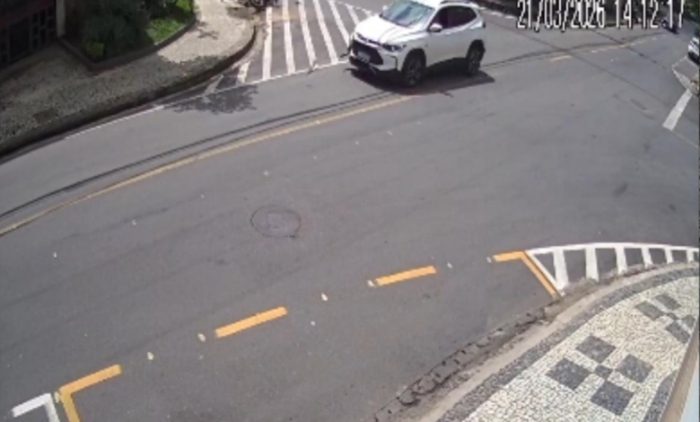 Um vídeo de uma câmera de segurança de uma residência próxima ao local mostrou o momento em que, com o impacto da colisão, o motociclista é arremessado para fora da moto.